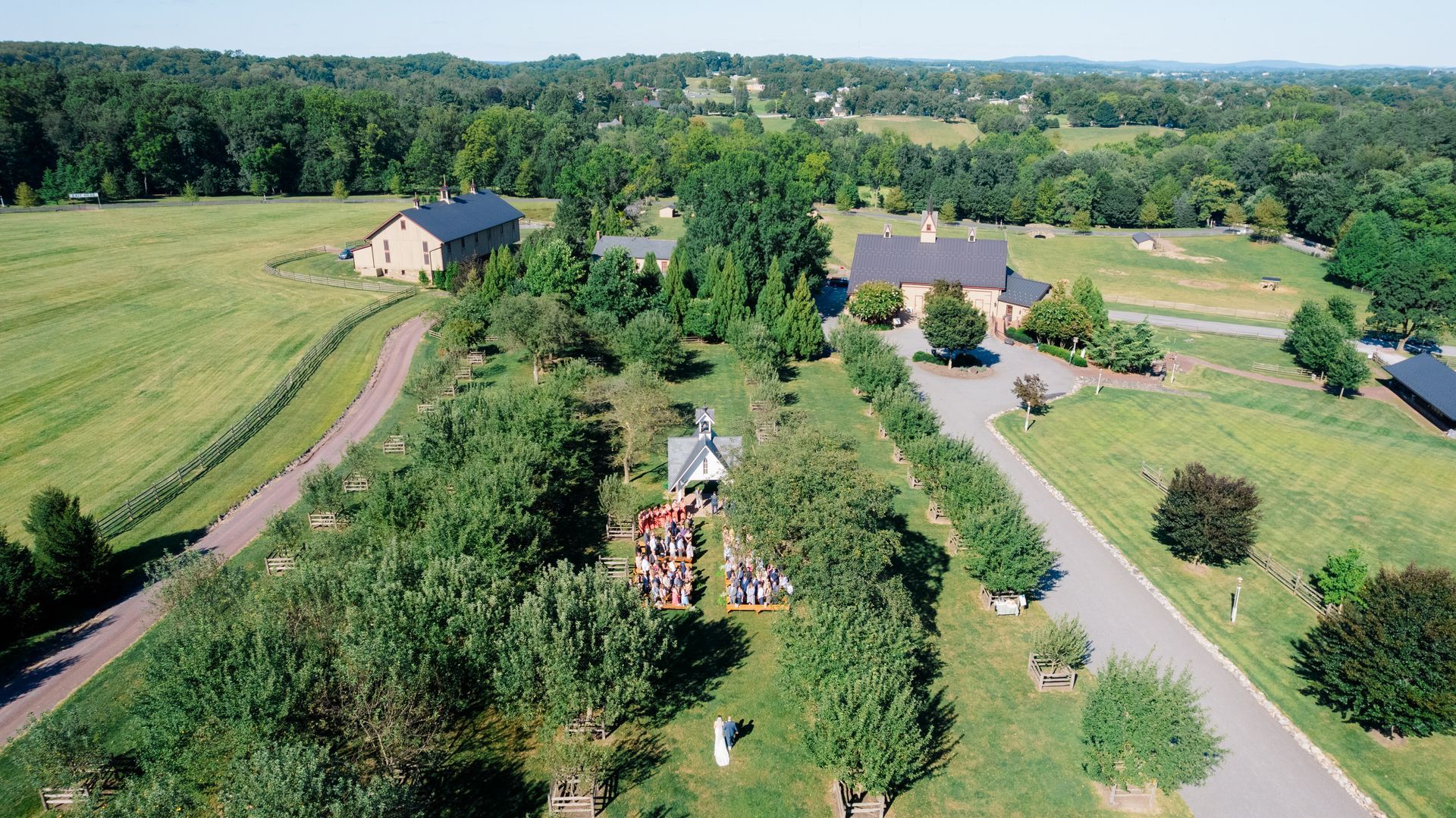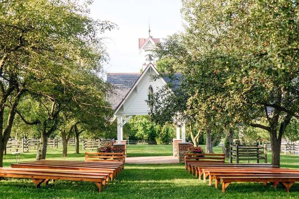 Another favorite outdoor ceremony site is the charming apple orchard, with a picturesque white bell tower, and wooden benches. It's a natural and serene setting that’s often described as a hidden gem—and a highly desirable location for outdoor ceremonies.