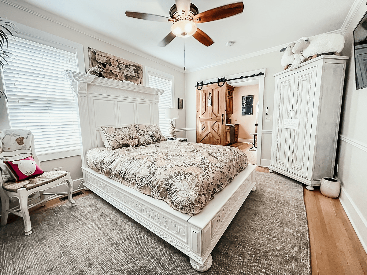 Enjoy your overnight stay as you are surrounded by the evening lights of The Star Barn Village. Spend time sitting on your own private veranda overlooking Lake Liberty. The cottage interior includes a plush Queen bed, fireplace and a large bathroom providing a romantic claw-foot tub and walk-in shower. A hospitality center awaits with coffee, tea, water, microwave, refrigerator, and large screen TV. Enjoy breathtaking views of the iconic Star Barn.