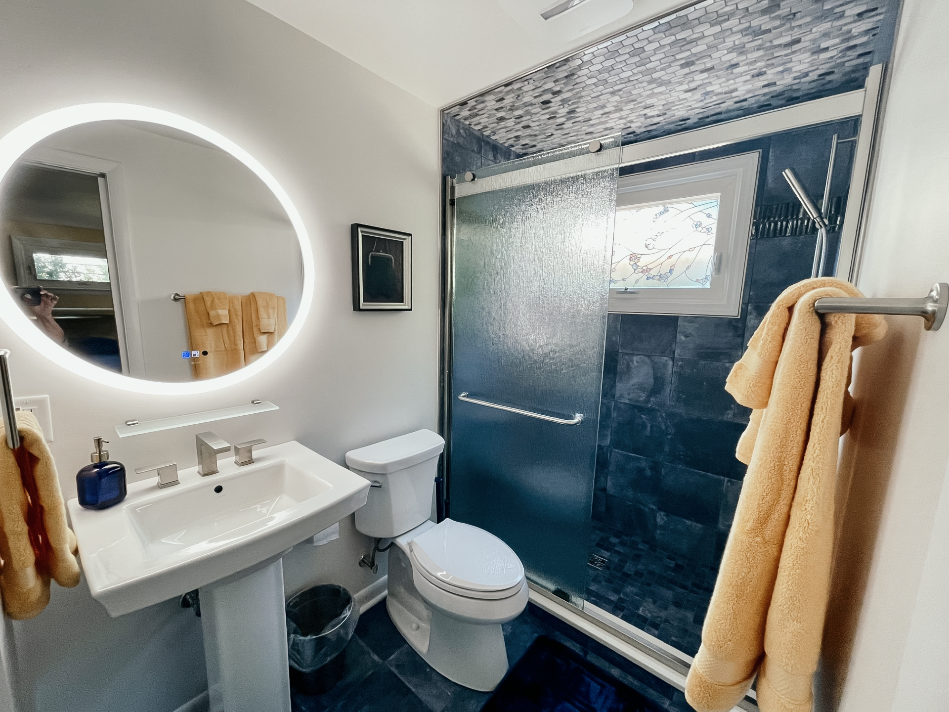 This petite gem represents the Retro 50’s look throughout! The original aqua stove top and oven were pivotal in the kitchen design and a matching refrigerator was added. Walls were moved and bathrooms created to make this a stylish 3 bedroom/3 bathroom casa. A customized Murphy Bed is available if a third bed is needed. You will discover a huge deck with a grill and views that overlook the horse pastures. A stone fire-pit is nearby for toasting marshmallows. No youth under 18 are permitted.