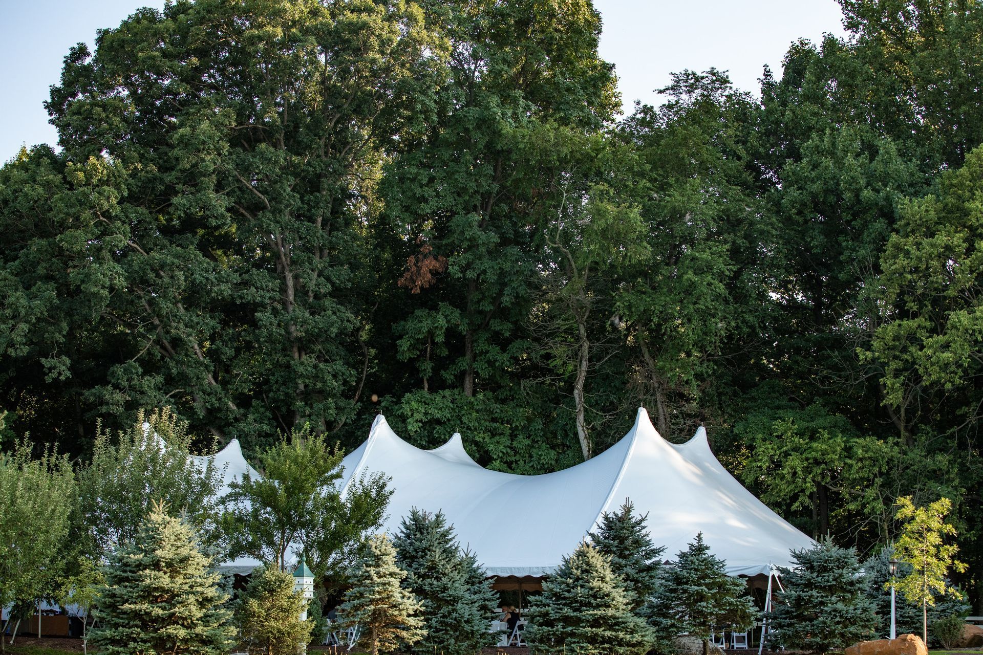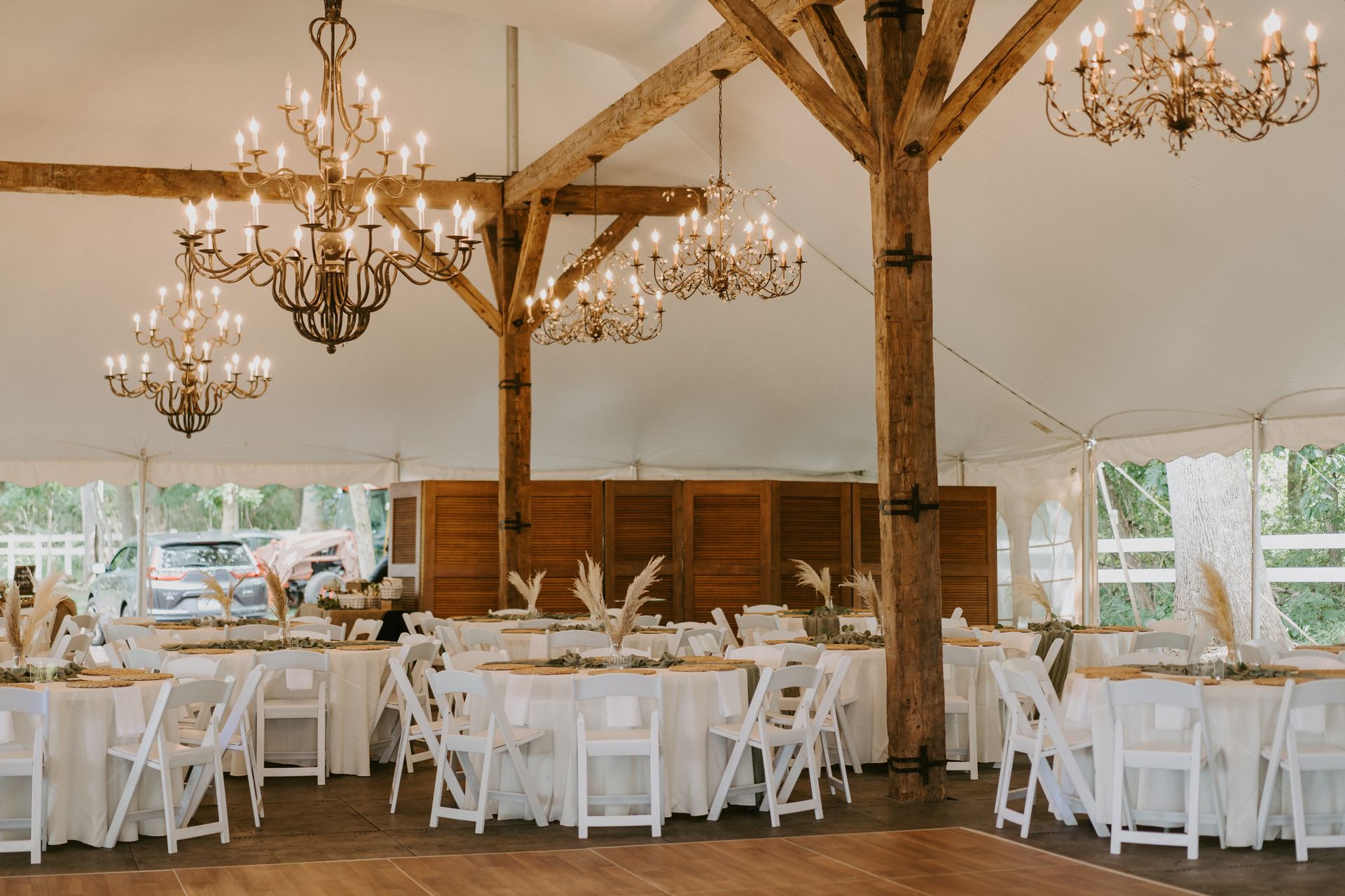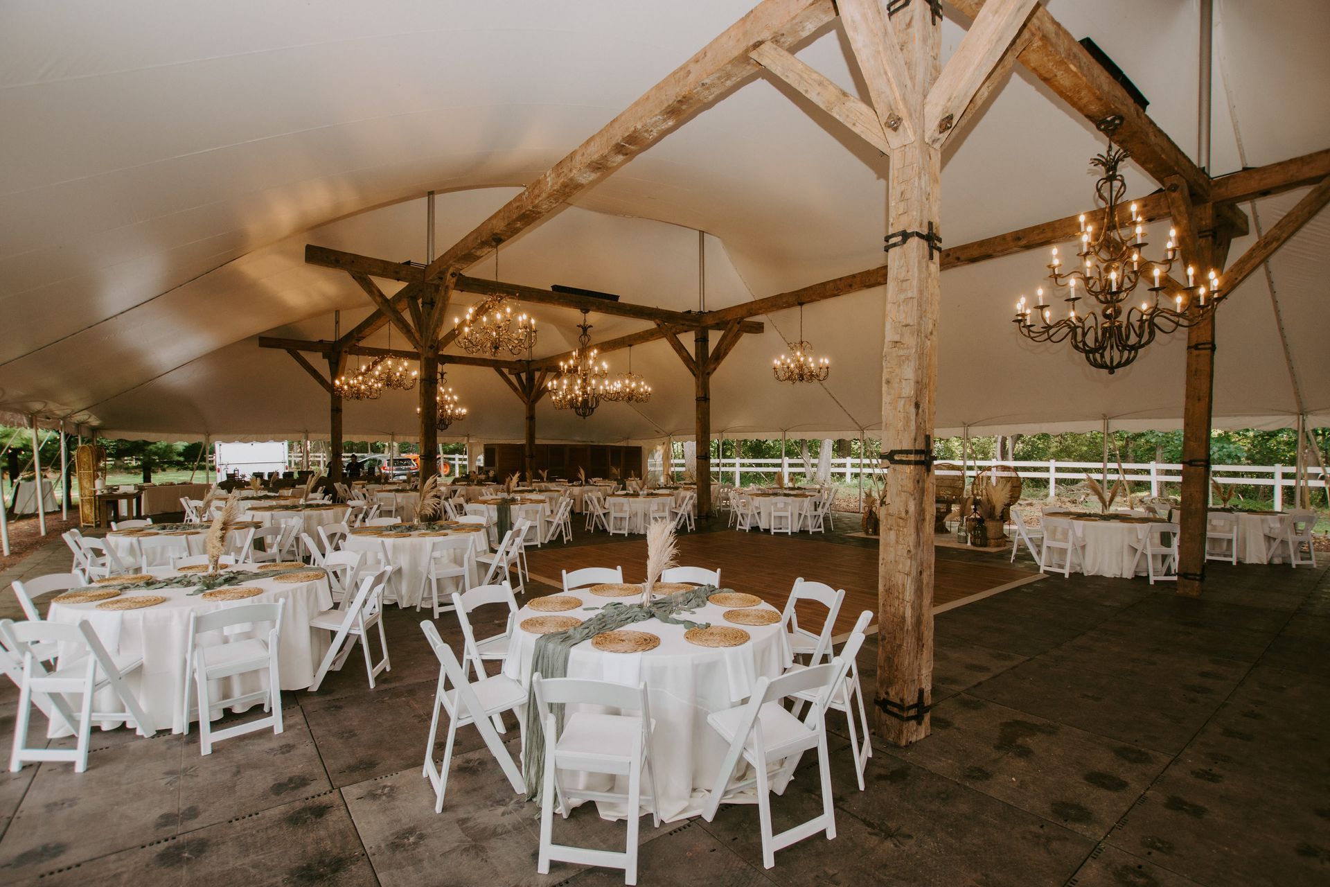 Set in a tranquil corner of the estate beneath a canopy of white pines and surrounded by fruit trees and forest, the Grande Canopy Tuscan Tent brings outdoor elegance to life. This awe-inspiring structure features massive, hand-hewn wood beams, paired with chandeliers, and a wooden dancefloor to evoke the feel of a grand outdoor ballroom. Whether for an outdoor wedding reception, cocktail hour or special private event, the space comfortably seats up to 250 guests, offering unmatched ambiance and spectacular views from every angle. The hanging lights and nearby stone benches complete this one-of-a-kind venue, making it a standout at this Lancaster County wedding venue.