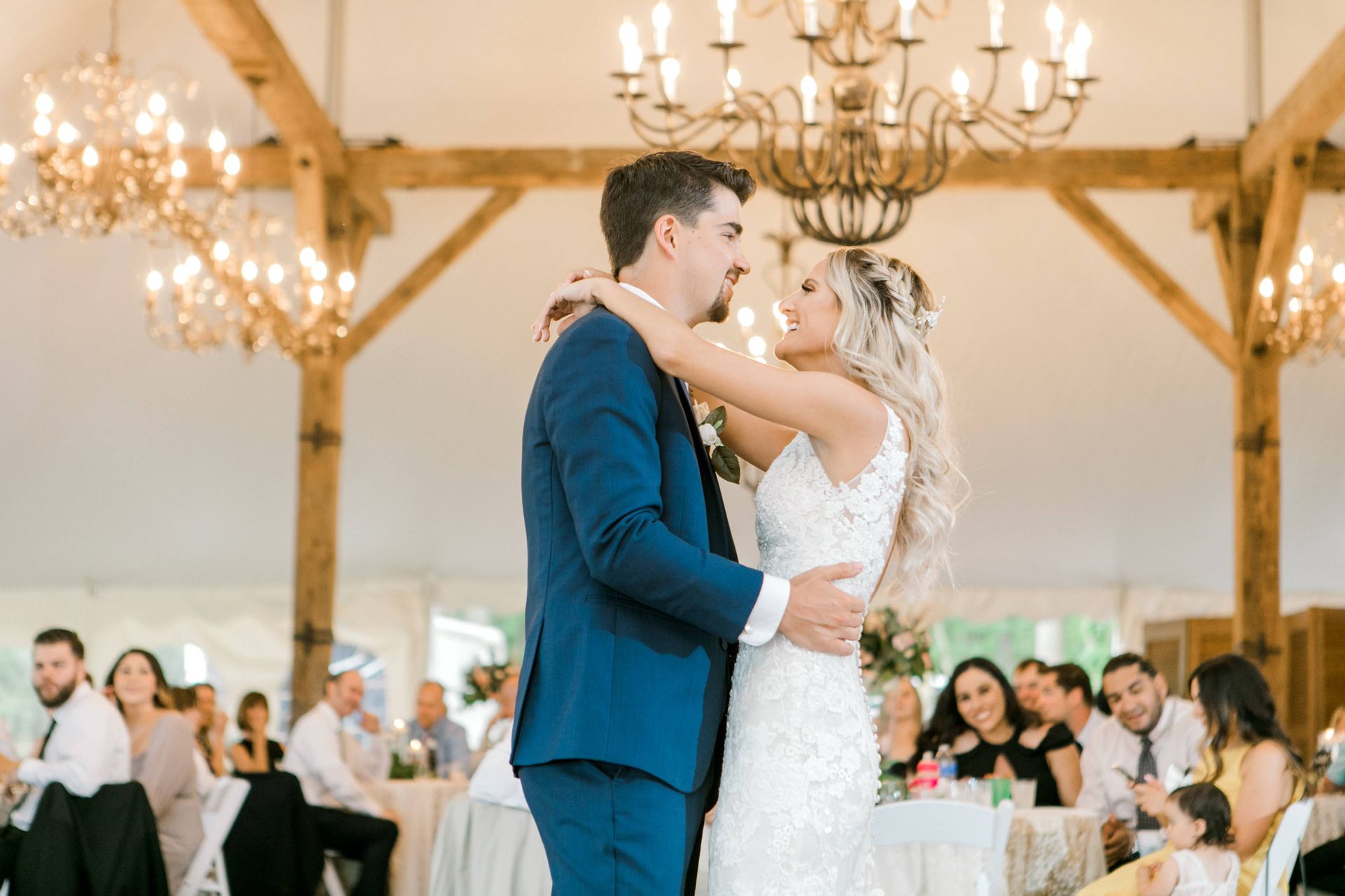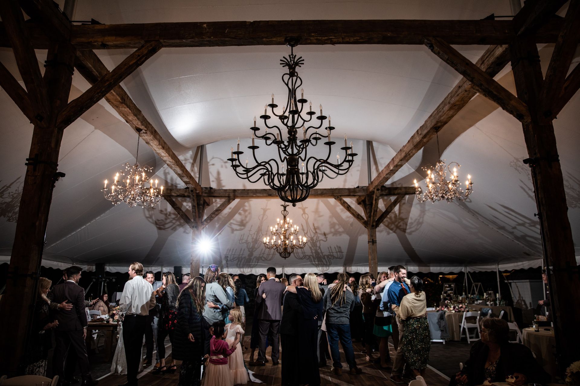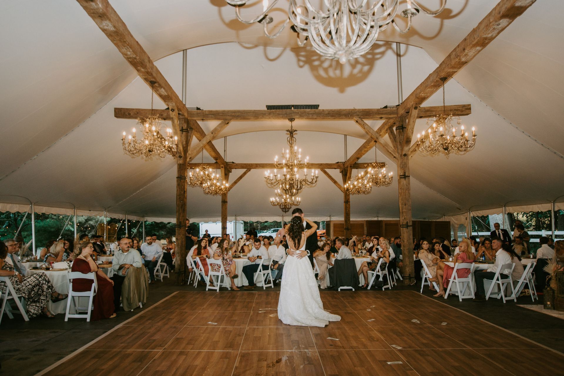 Set in a tranquil corner of the estate beneath a canopy of white pines and surrounded by fruit trees and forest, the Grande Canopy Tuscan Tent brings outdoor elegance to life. This awe-inspiring structure features massive, hand-hewn wood beams, paired with chandeliers, and a wooden dancefloor to evoke the feel of a grand outdoor ballroom. Whether for an outdoor wedding reception, cocktail hour or special private event, the space comfortably seats up to 250 guests, offering unmatched ambiance and spectacular views from every angle. The hanging lights and nearby stone benches complete this one-of-a-kind venue, making it a standout at this Lancaster County wedding venue.