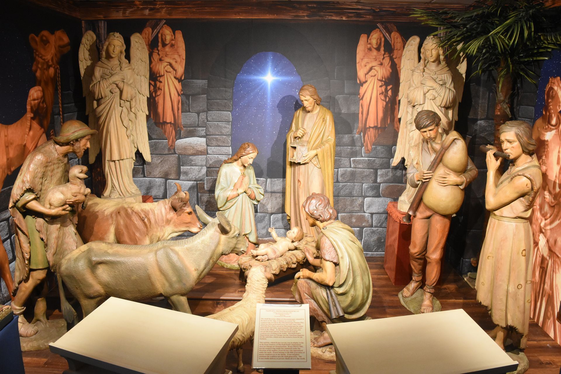 One of the major highlights is the resurrection of our large, wooden, hand-carved Nativity. In years past, the spectacular Nativity was on display inside the Star Barn and also inside the Main Barn at Ironstone Ranch. As our estate events grew in size, and space was needed in those barns, the large Nativity was temporarily put into storage much to the disappointment of our guests. However, for 2025, it has been dusted off and moved into The National Christmas Center! This one-of-a-kind Nativity was hand carved from basswood by Ludwig Andreas Kraus (1921-1982) of Oberammergau, Germany between 1958 and 1965. The Nativity was on display in the Marshall Field's Department Store at their flagship store in Chicago until Target purchased the store in 1990. It then found its way to The National Christmas Center in Paradise, PA where it was displayed for many years before The National Christmas Center was purchased by David Abel and moved to its current location.